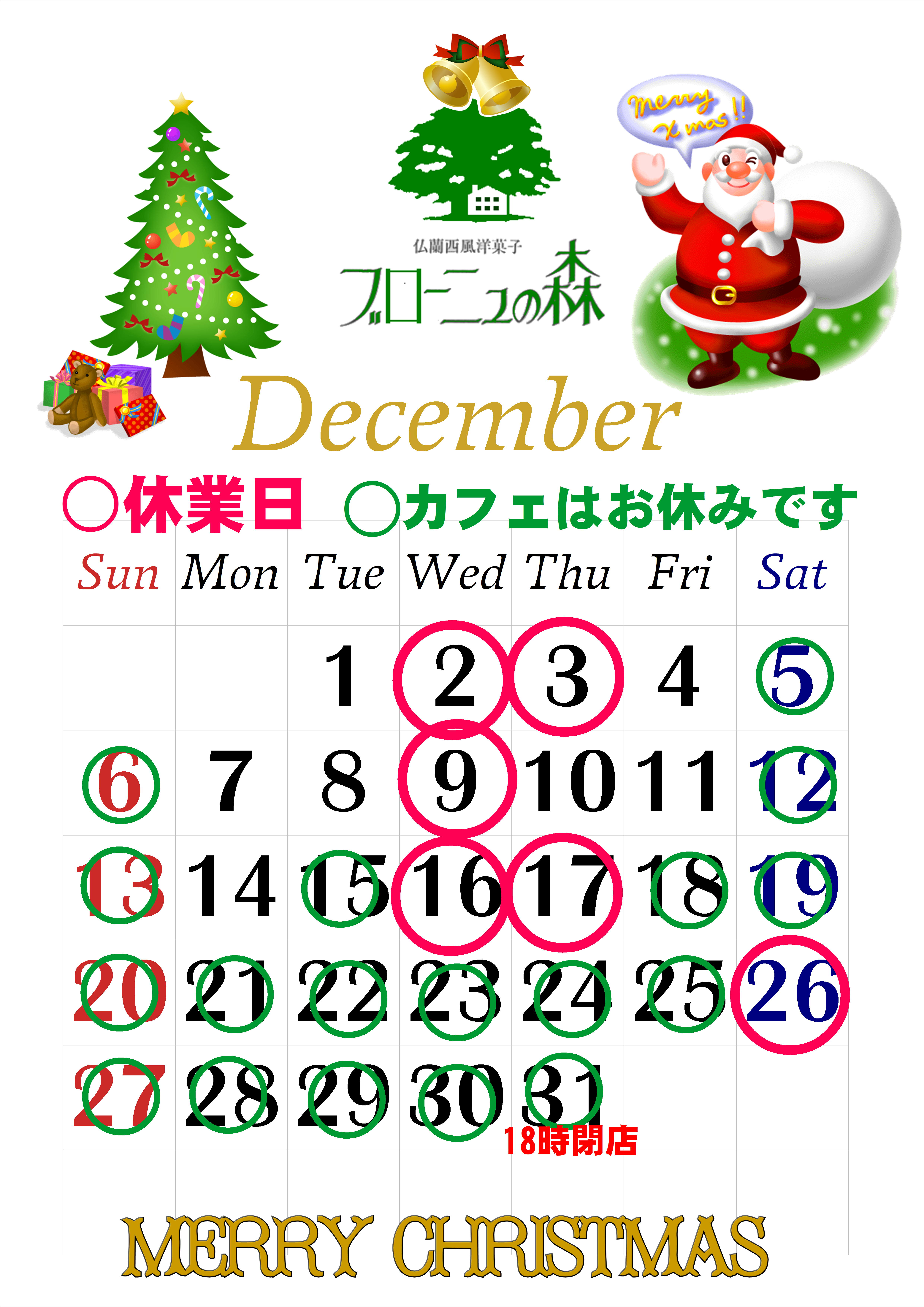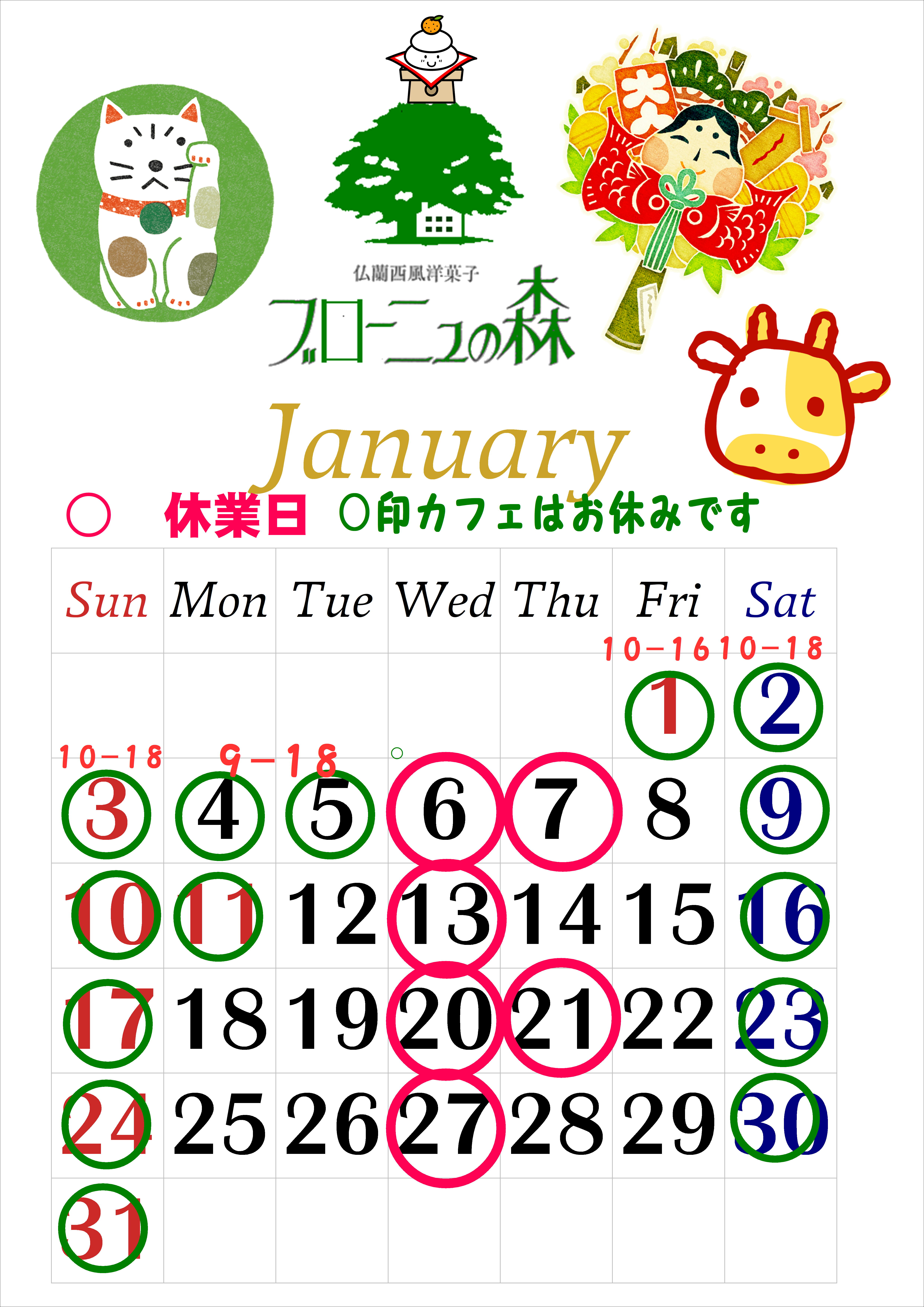 営業カレンダー12月 1月 2020/12/05 12月23日(水)30日(水)営業 12月26日(土)臨時休業 12月31日(木)18時閉店 12月15日~年内カフェはお休みです 1月1日(金) 10時~16時 カフェ休業 1月2日(土)3日(日) 10時~18時 カフェ休業 1月4日(月)5日(火) 9時~18時 カフェ休業 年末年始(12月27日~1月5日)のプリントケーキは12月19日までにご予約下さい
